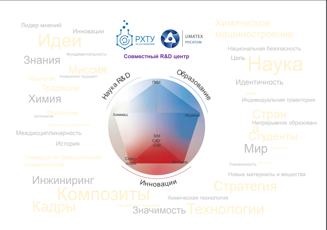 Российский химико-технологический университет имени Д. И. Менделеева (РХТУ) и компания UMATEX Group ГК «Росатом» (UMATEX Group) создали совместный R&D Центр индустрии новых полимерных и композитных материалов (R&D Центр). Реализация направлений проекта осуществляется в рамках программы развития университета на 2021-2030 годы "Приоритет-2030".